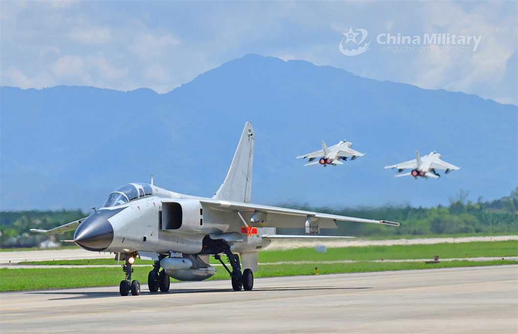 A fighter jet attached to an aviation brigade under the PLA Air Force taxies on the runway before takeoff as another two fighters take off simultaneously during a flight training exercise on June 14, 2024. (eng.chinamil.com.cn/Photo by Zhuo Lingpeng)