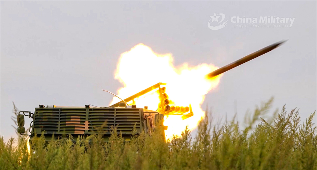 A vehicle-mounted rocket launcher attached to an artillery unit of a brigade under the PLA 75th Group Army fires at mock targets during a live-fire training exercise on June 11, 2024. (eng.chinamil.com.cn/Photo by Xiao Kai)