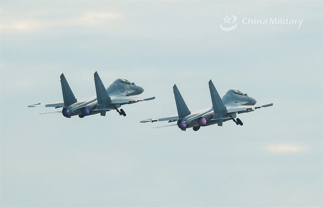Two fighter jets attached to an aviation brigade with the air force under the PLA Southern Theater Command take off in formation during a flight training exercise on June 23, 2024. (eng.chinamil.com.cn/Photo by Zhang Weishan, Wang Xinwei)