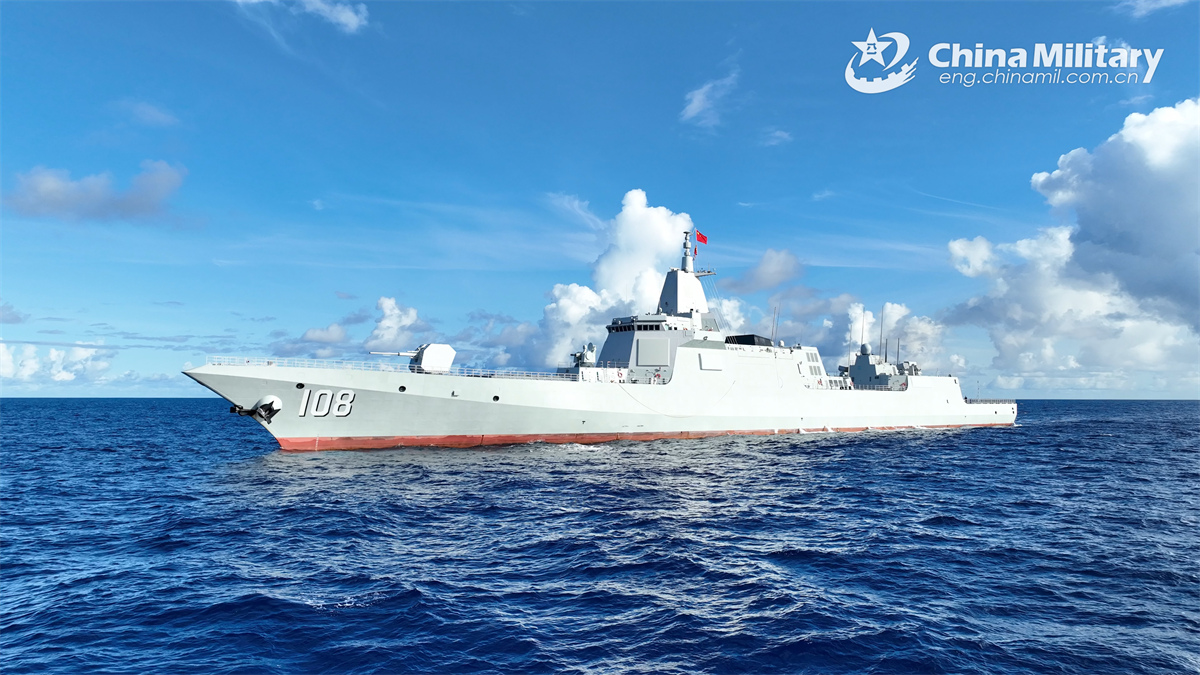 Type-055 guided-missile destroyer Xianyang (Hull 108) attached to a naval destroyer flotilla under the Chinese PLA Southern Theater Command steams to the designated sea area during a multi-subject maritime drill on October 20, 2024. (eng.chinamil.com.cn/Photo by Zhou Tianyu)