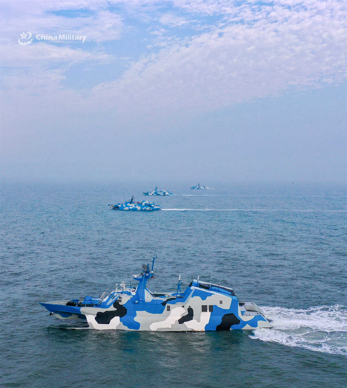 A group of fast attack missile boats attached to the Chinese PLA Navy sail at sea during a maritime training exercise on April 5, 2025. (eng.chinamil.com.cn/Photo by Wang Heqiu)