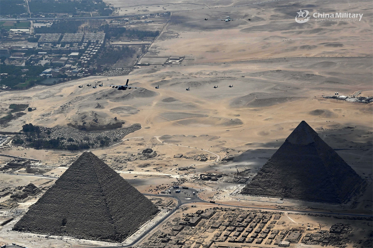 The China-Egypt "Eagles of Civilization 2025" joint air force training concluded at an Egyptian air force base on May 4, 2025. Photo shows Chinese and Egyptian aircraft flying over pyramid in formation at ultra-low altitude on May 1. (eng.chinamil.com.cn/Photo by Yu Hongchun)