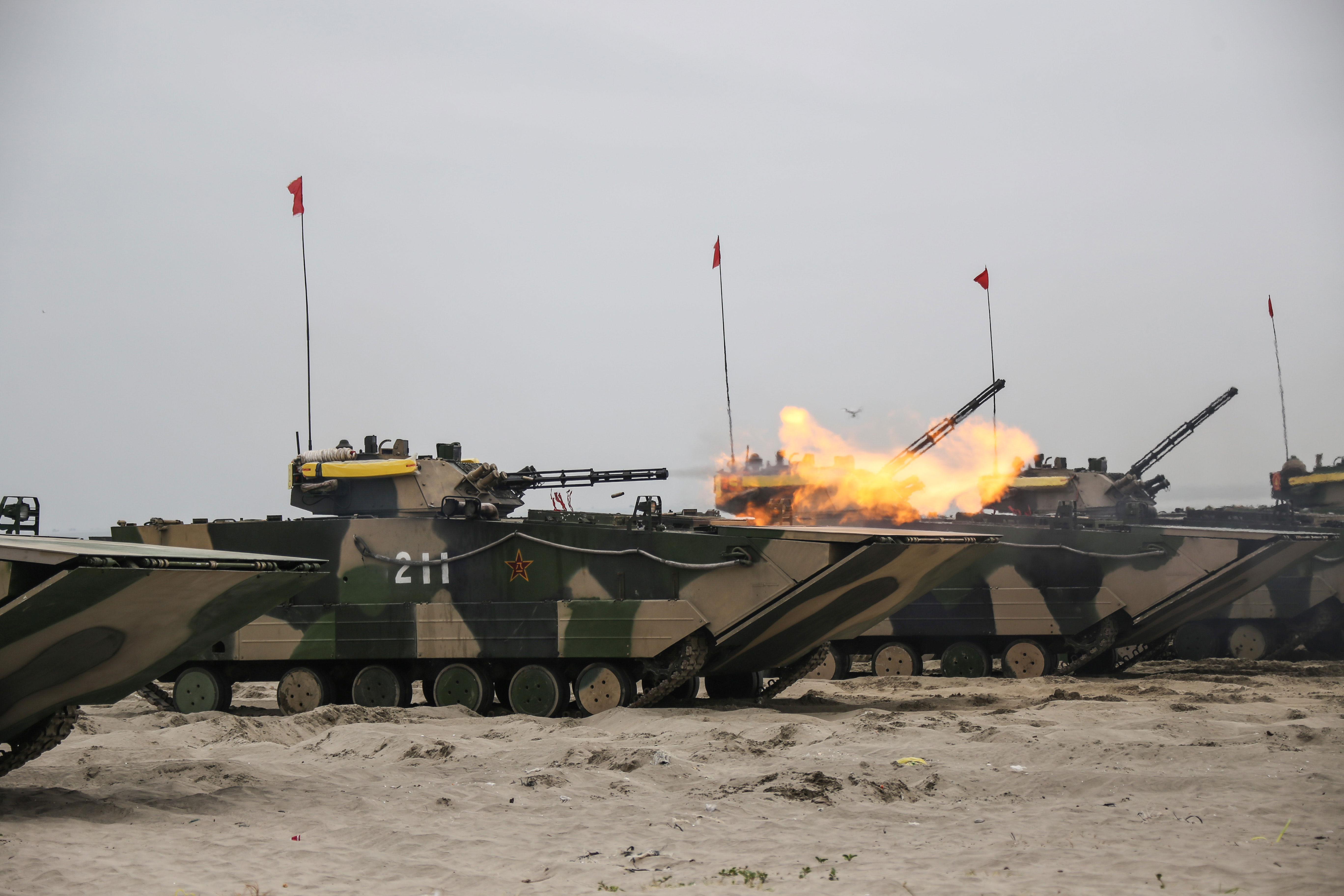 A group of Type-05 infantry fighting vehicles (IFVs) attached to a brigade under the PLA 74th Group Army conduct a salvo of 30mm shells during a live-fire operation on April 13, 2018. (eng.chinamil.com.cn/Photo by Li Bin)