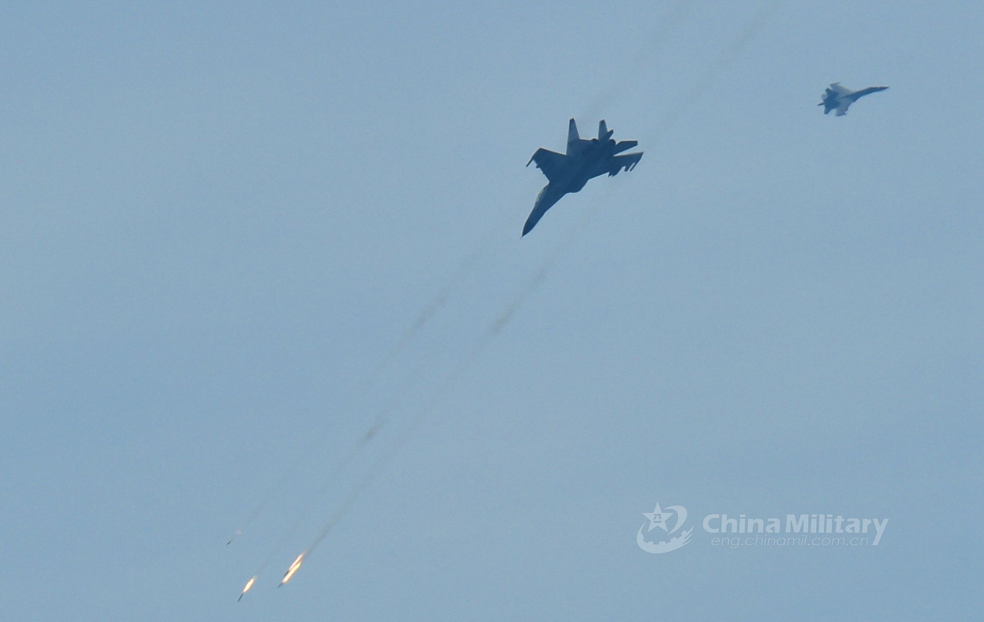 A fighter jet attached to an aviation brigade of the South China Sea Fleet under the PLA Navy fires at mock sea targets during a live-fire training exercise at a shooting range in the South China Sea from May 17 to 18, 2018. (eng.chinamil.com.cn/Photo by Gao Hongwei)