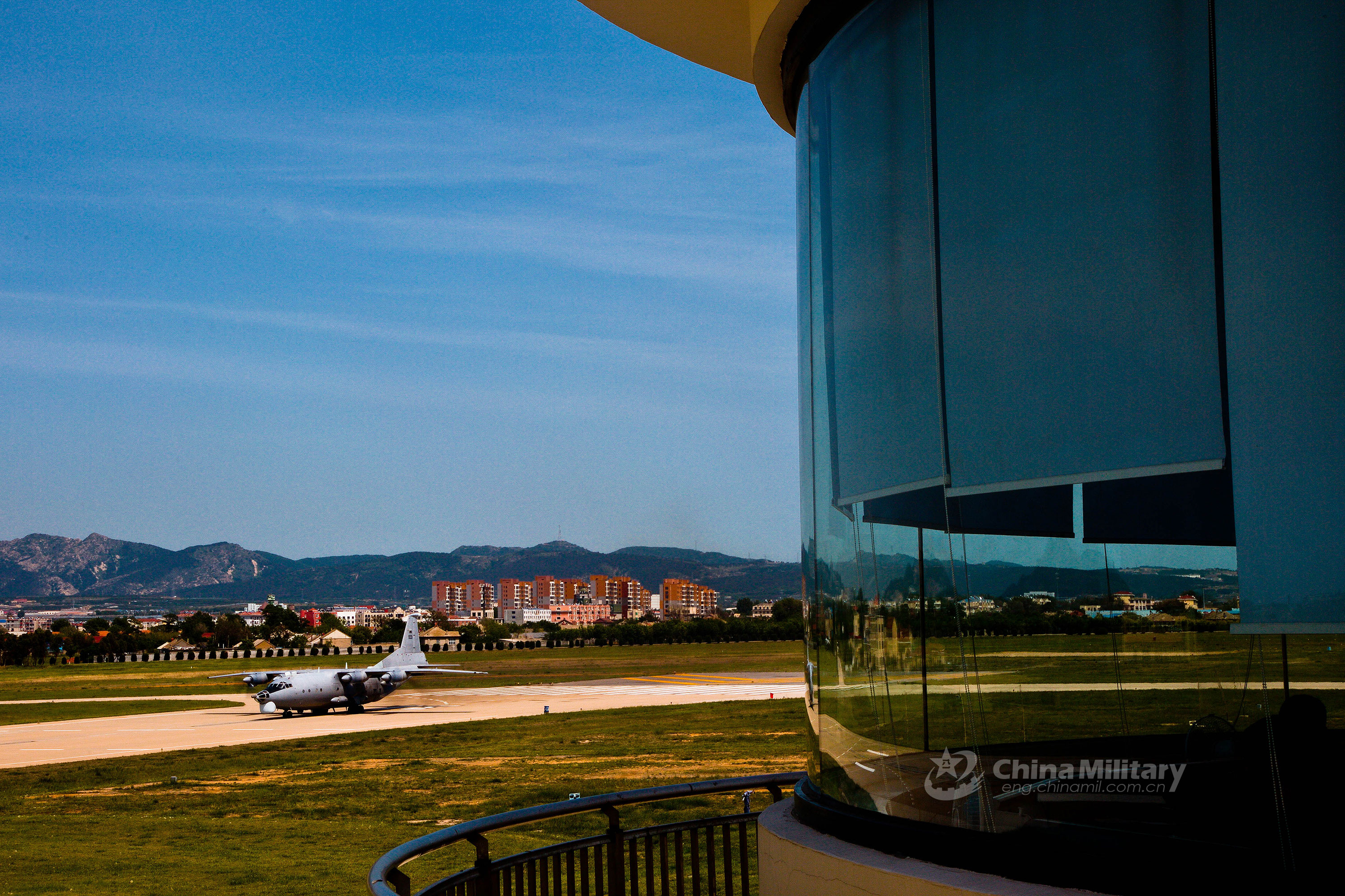 A Y-8 reconnaissance aircraft attached to an aviation regiment of the North China Sea Fleet under the PLA Navy taxies on the runway in preparation for takeoff during a recent flight training exercise in northeastern China's Liaodong Peninsula. (eng.chinamil.com.cn/Photo by Fu Dongchen and Hu Kun)