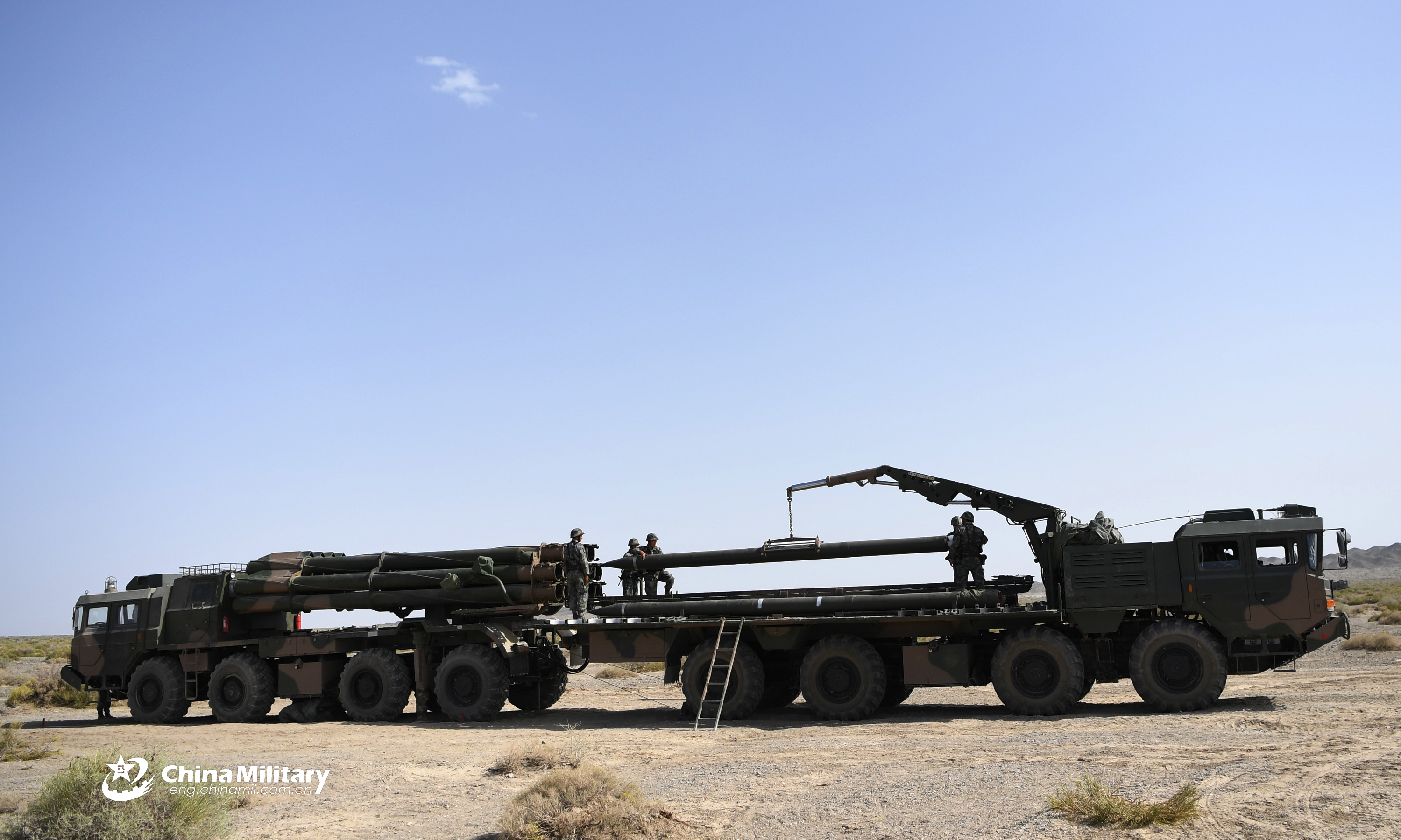 Artillerymen assigned to an artillery brigade under the PLA 78th Group Army prepare a PHL-03 multiple launch rocket system (MLRS) during a live-fire operation in northwest China's Gobi Desert from July 22 to 23, 2018. (eng.chinamil.com.cn/Photo by Yang Zaixin)