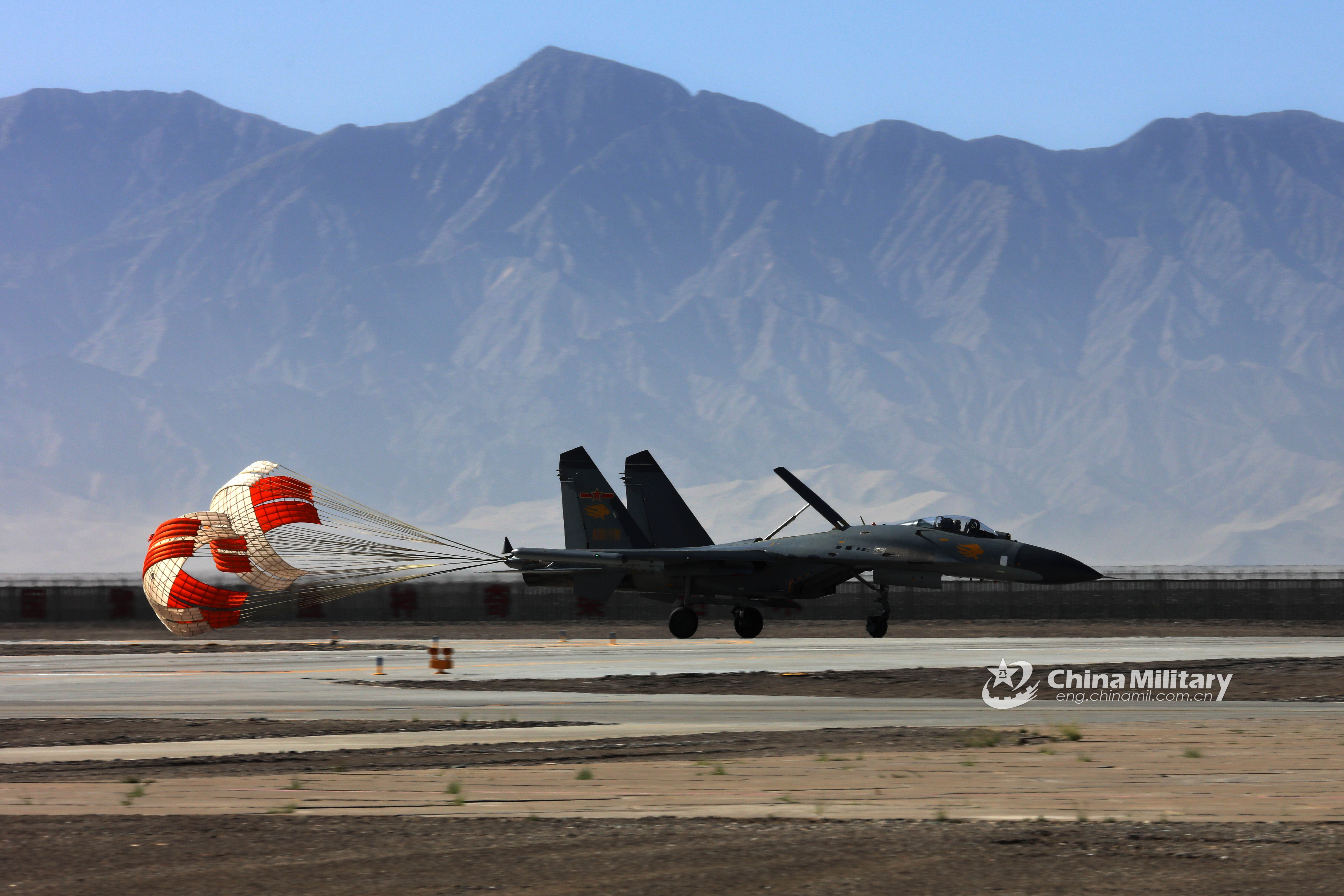 A J-11 fighter jet attached to an aviation brigade of the air force under the PLA Western Theater Command deploys its drogue parachute to slow itself after landing at a military airfield during a flight training exercise in northwest China on July 25, 2018. (eng.chinamil.com.cn/Photo by Xi Bobo and Ma Peng)
