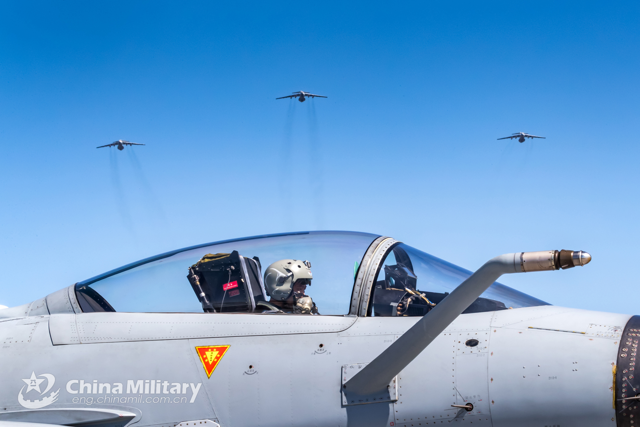 A Chinese pilot gets settled in the cockpit of a J-10A fighter jet before takeoff as three Russian transport aircraft fly overhead during a flight training exercise for the “Aviadarts” event on August 1, 2018. The "Aviadarts" event of the “International Army Games (IAG) 2018” kicked off in central Russia’s Ryazan Region on July 29. Pilots from four countries including China, Russia, Belarus and Kazakhstan participate in this event. (eng.chinamil.com.cn/Photo by Yang Pan)
