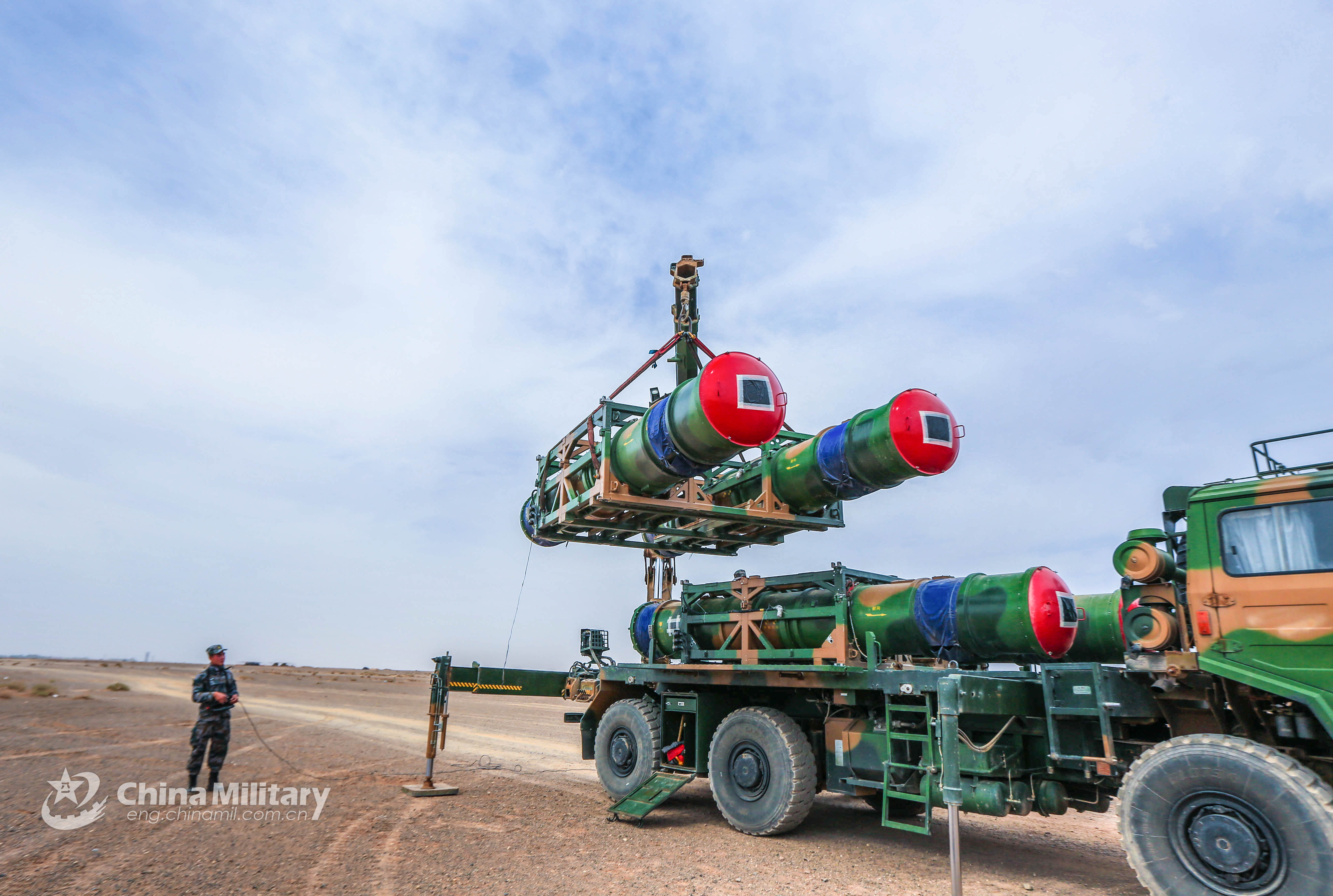 Soldiers assigned to an air-defense brigade under the PLA 72nd Group Army operate a crane to hoist and load HQ-16 medium-range air-defense missiles onto a missile launching truck during recent training. (eng.chinamil.com.cn/Photo by Tong Zujing)
