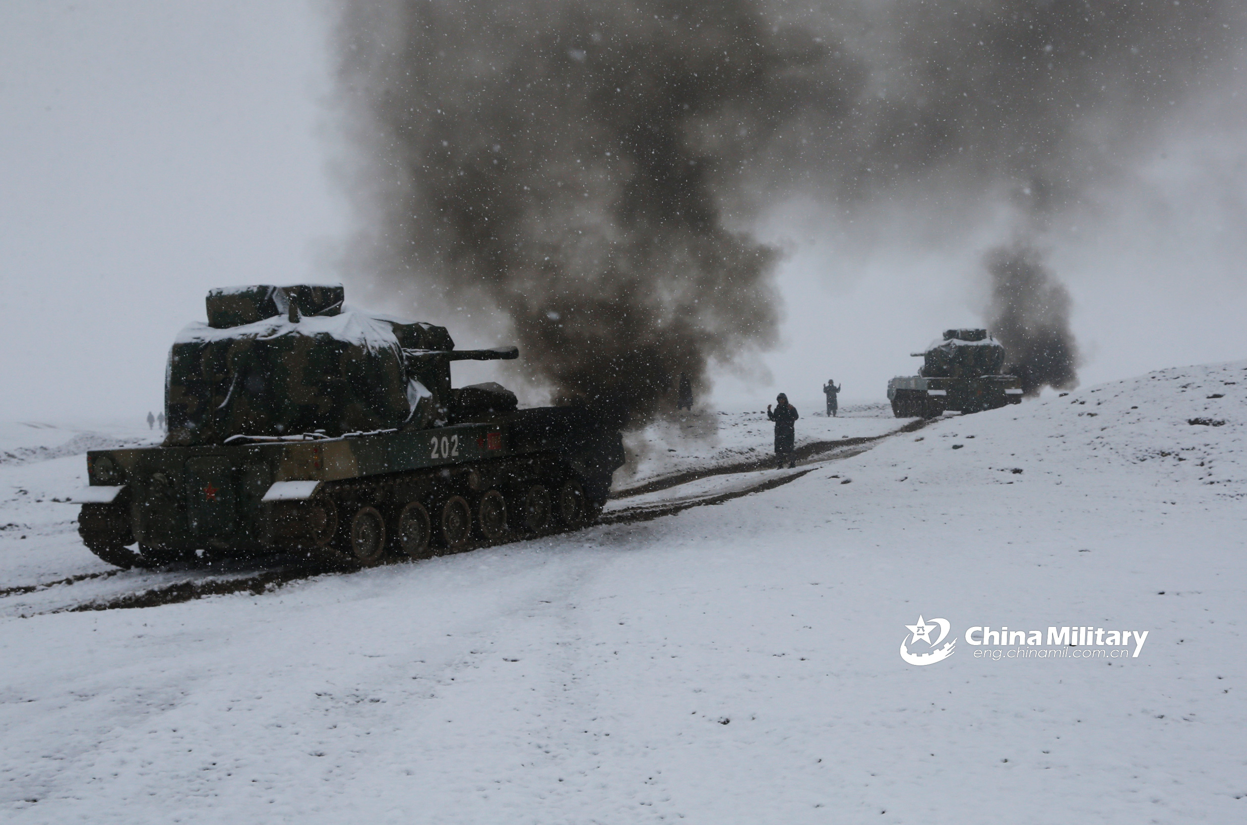 PGZ-07 twin 35mm self-propelled anti-aircraft gun systems attached to an air-defense detachment of a brigade under the PLA 76th Group Army maneuver in a snow-covered plateau area at an altitude of 4,000 meters on August 15, 2018. (eng.chinamil.com.cn/Photo by Li Zhongyuan)