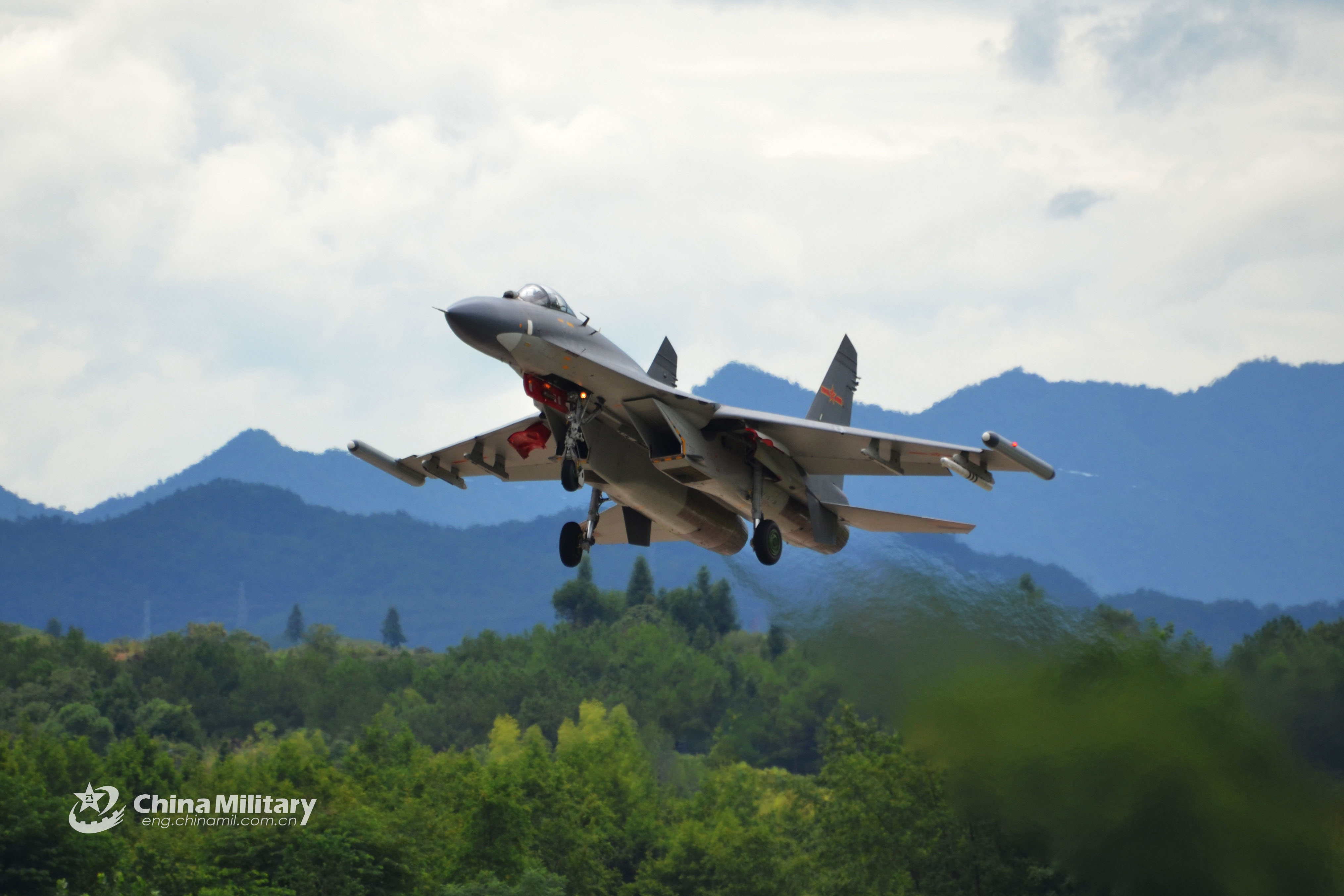 A J-11 fighter jet attached to an aviation brigade of the air force under the PLA Eastern Theater Command takes off from a military airfield during a flight training exercise on August 29, 2018. (eng.chinamil.com.cn/Photo by Fu Gan)
