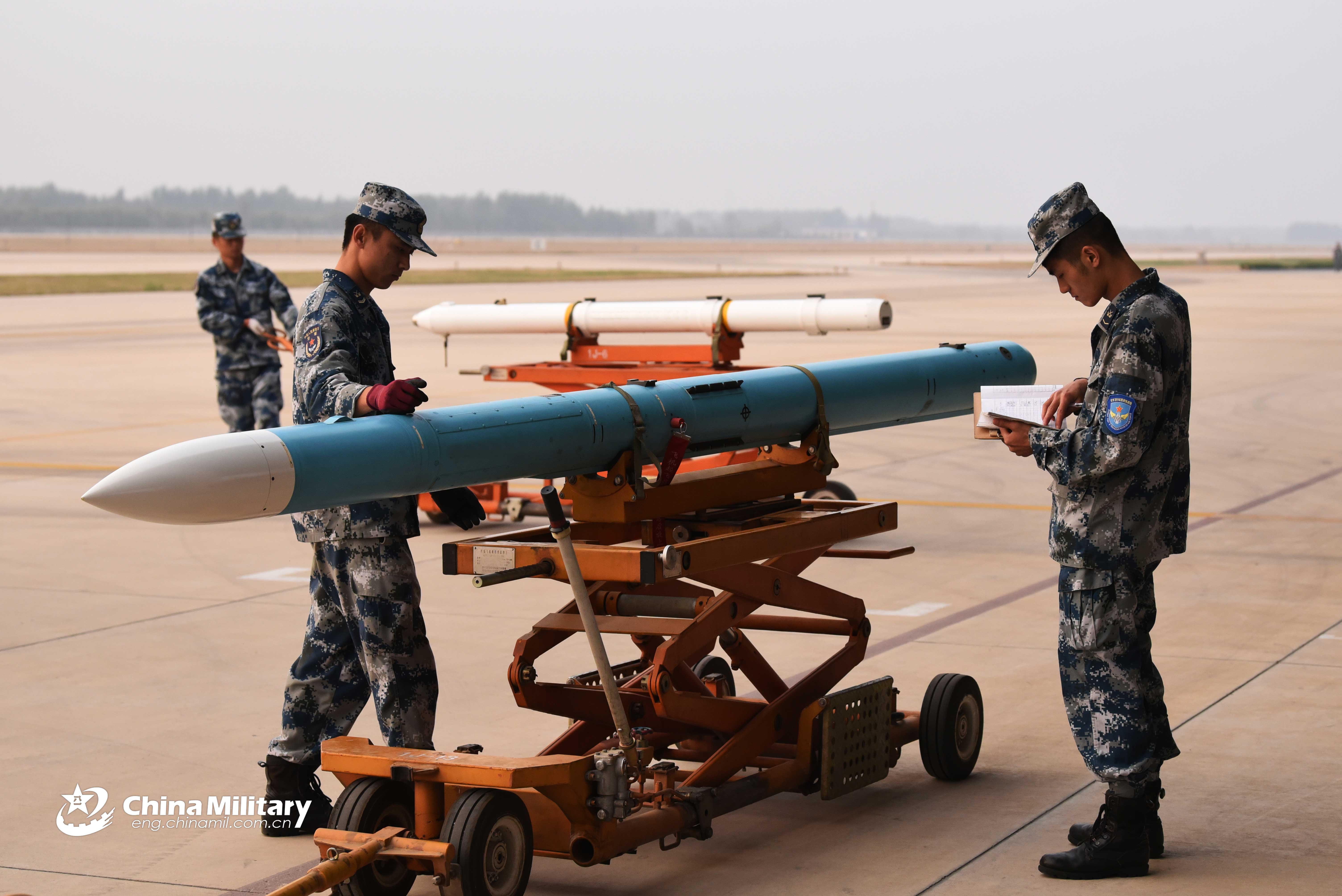 Maintenance men assigned to an aviation regiment under the PLA Air Force prepare ammunition for a J-11B fighter jet prior to a round-the-clock flight training exercise on October 23, 2018. (eng.chinamil.com.cn/Photo by Yuan Hua and Cao Weihong)