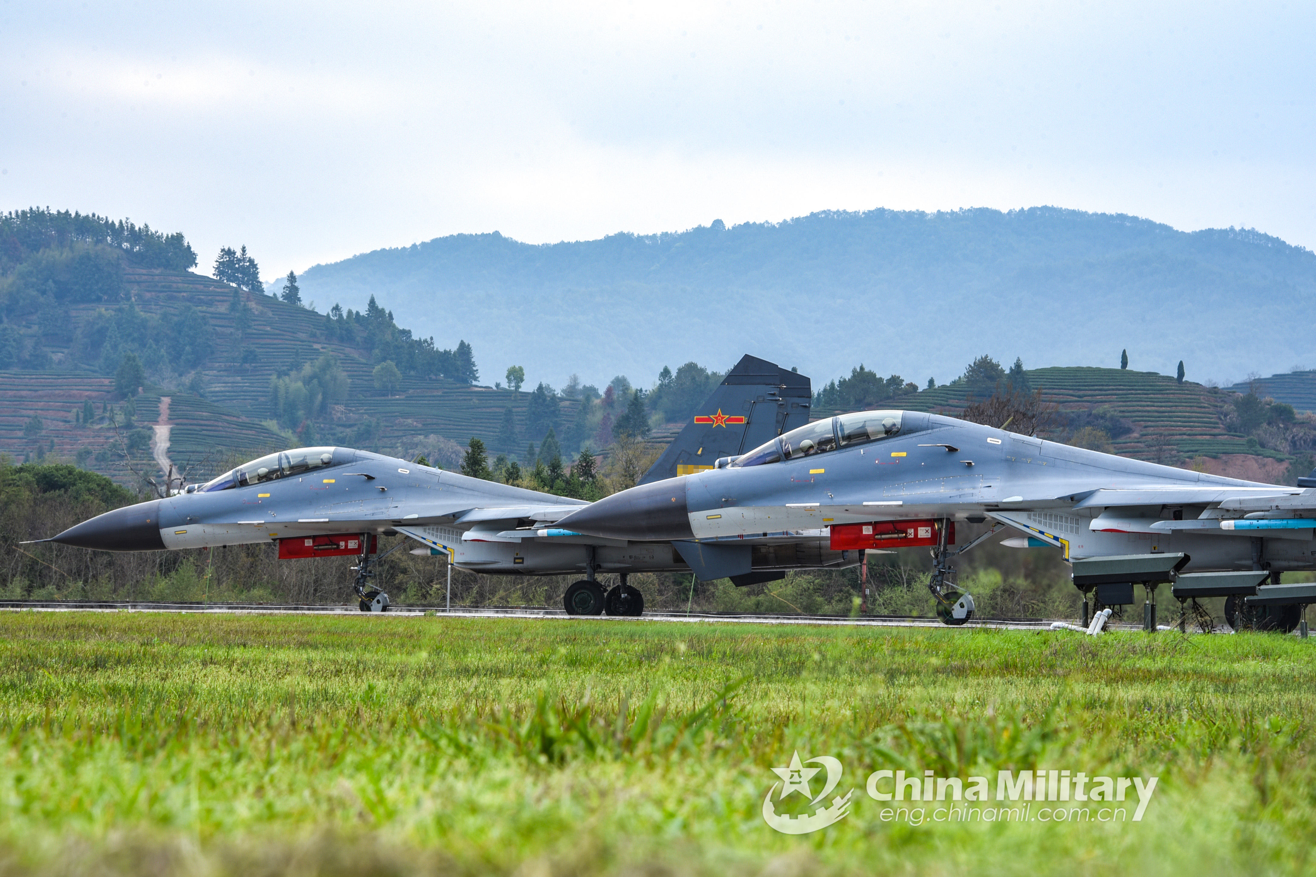 Two J-11 fighter jets attached to an aviation brigade of the air force under the PLA Eastern Theater Command sit on the flightline and await approvals to take off during a real combat flight training exercise on March 10, 2020. (eng.chinamil.com.cn/Photo by Fu Gan)