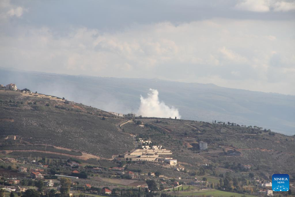 Smoke rises following an Israeli shelling in Khiam, Lebanon, on Dec. 14, 2023. The Lebanese-Israeli confrontations continued on Thursday in the border area, killing a Hezbollah fighter and a civilian, Lebanese military sources told Xinhua. (Photo by Taher Abou Hamdan/Xinhua)