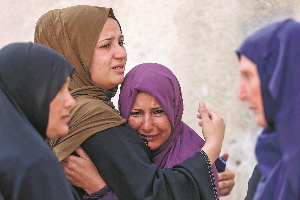Women mourn relatives killed in an Israeli strike at Al-Shifa hospital in Gaza City on Monday. OMAR AL-QATTAA/AFP