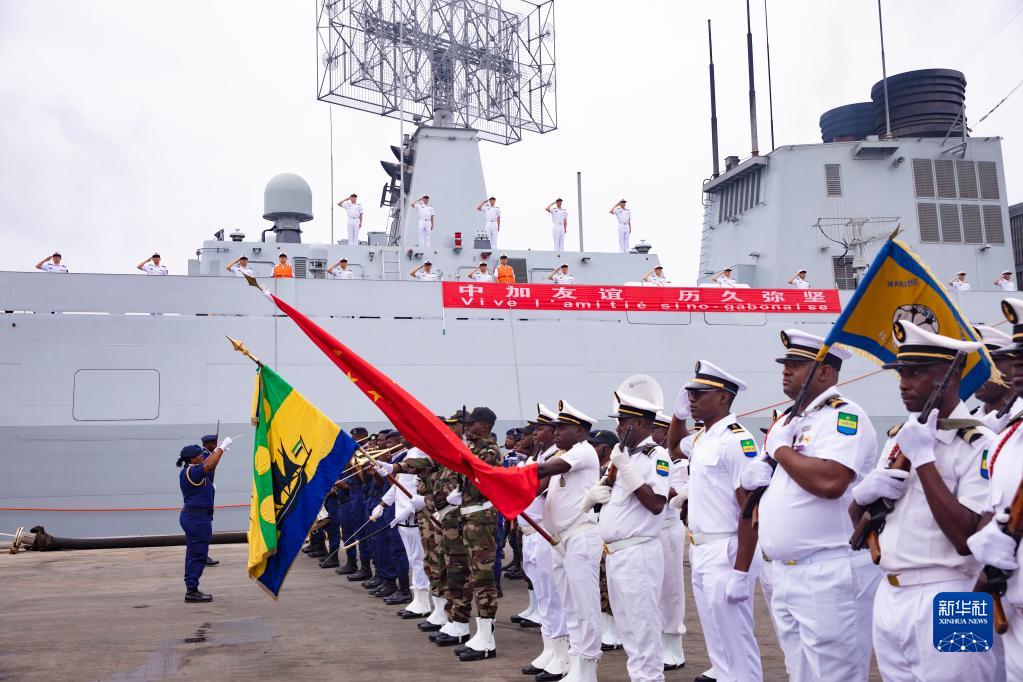 After the both sides exchanged greetings, the commander of the visiting taskforce inspected the Gabonese naval honor guard. And then, Chinese ambassador together with Gabonese defense secretary-general boarded the Chinese naval guided-missile destroyer Nanning for a visit, where the secretary-general inspected the honor guard of the ship Nanning, accompanied by the captain and the political commissar of the ship.