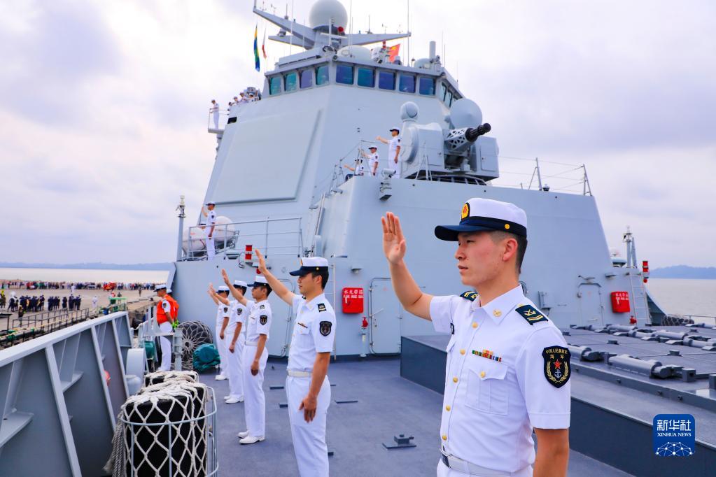 Sailors attached to the 43rd Chinese naval escort taskforce man the rails as the ship arrives at the Owendo Port in Libreville, Gabon, on July 8, 2023. (Xinhua/Liu Zhehao)