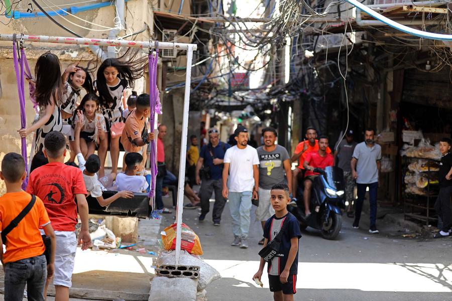 Children play at the Burj Barajneh refugee camp during Eid al-Adha in Beirut, Lebanon, on June 17, 2024. (Xinhua/Bilal Jawich)