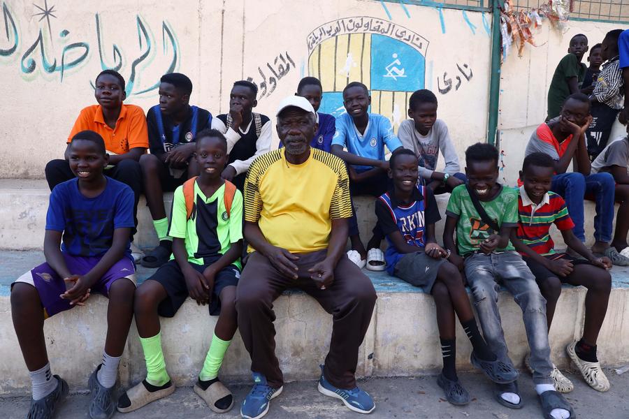 Kamal Mahmoud (C), a Sudanese working as a football coach, sits with refugee boys during a football game at a sports academy in Cairo, Egypt, on June 18, 2024. (Xinhua/Ahmed Gomaa)