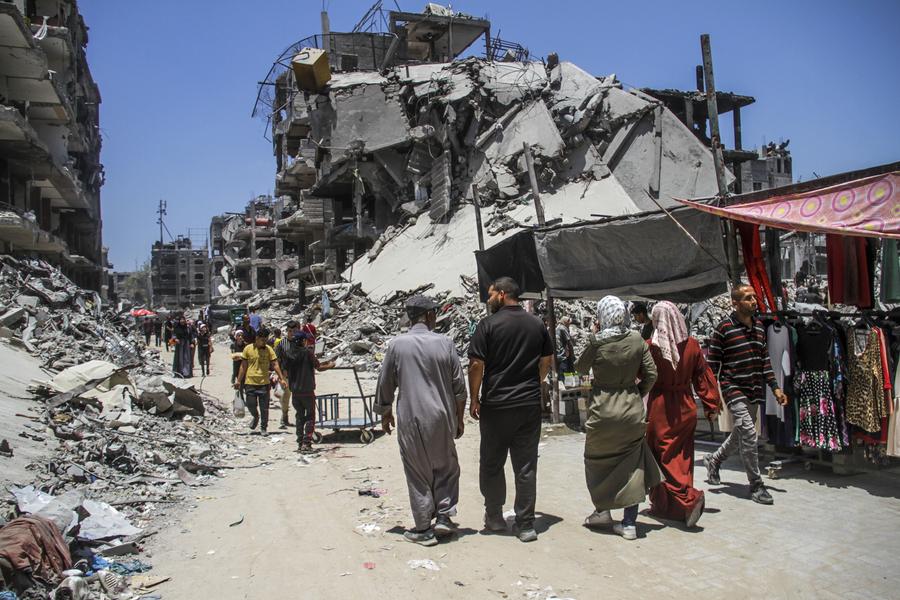 Palestinians walk in a market of the Jabalia refugee camp in the northern Gaza Strip, on June 20, 2024. (Photo by Mahmoud Zaki/Xinhua)