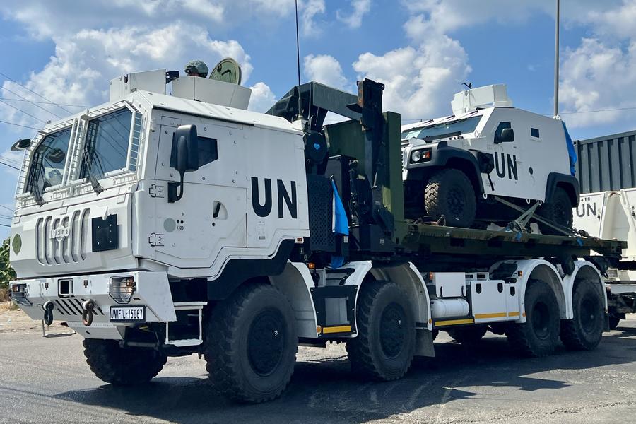 This photo shows UN vehicles in Tyre, Lebanon, on Aug. 29, 2024. (Photo by Ali Hashisho/Xinhua)
