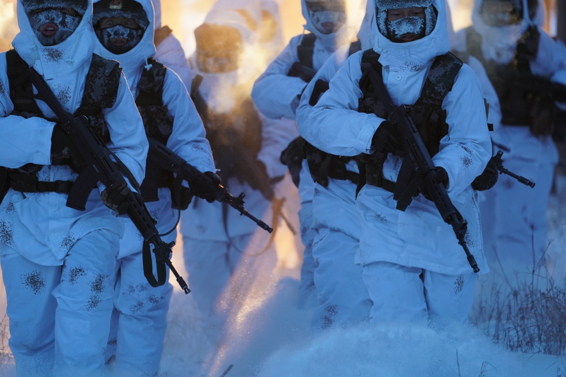 Soldiers take part in a training in Beiji Village of the border county Mohe, northeast China's Heilongjiang Province, Feb. 5, 2018. Soldiers stick to their post at the border in spite of the severe cold in Mohe where the temperature has dropped to minus 40 degrees Celsius. (Xinhua/Li Gang)