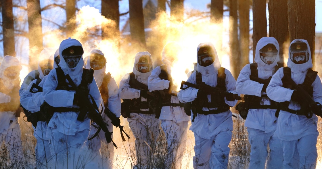 Soldiers take part in a training in Beiji Village of the border county Mohe, northeast China's Heilongjiang Province, Feb. 5, 2018. Soldiers stick to their post at the border in spite of the severe cold in Mohe where the temperature has dropped to minus 40 degrees Celsius. (Xinhua/Li Gang)
