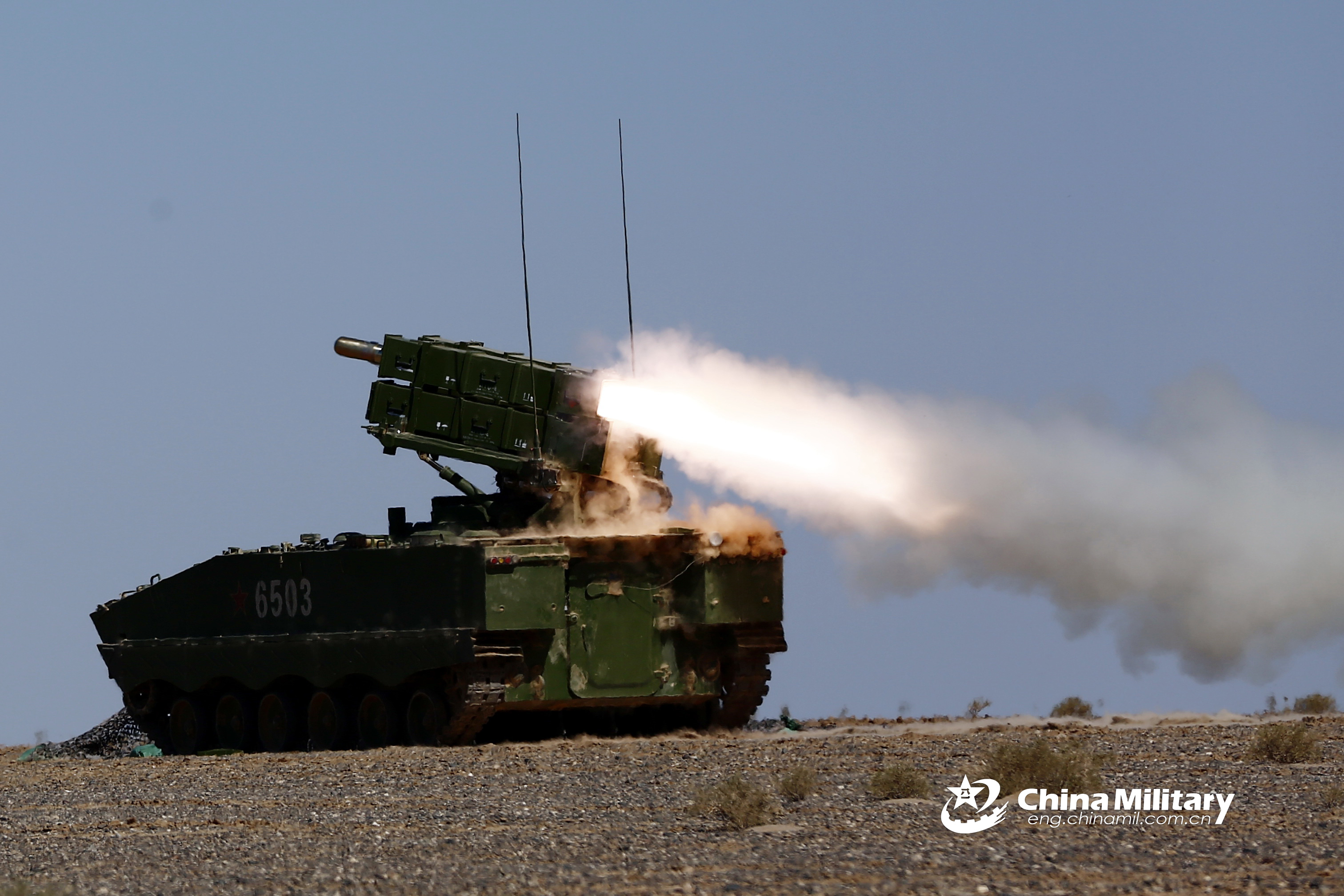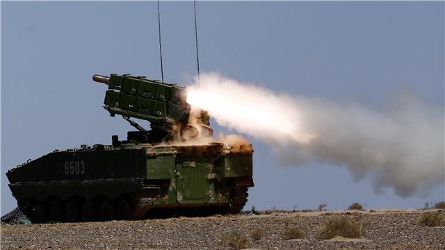 An HJ-10 anti-tank missile system attached to an anti-tank missile detachment under the PLA 72nd Group Army fires at mock targets during a recent live-fire training exercise in northwest China's desert area. (eng.chinamil.com.cn/Photo by Zhang Wenju)
