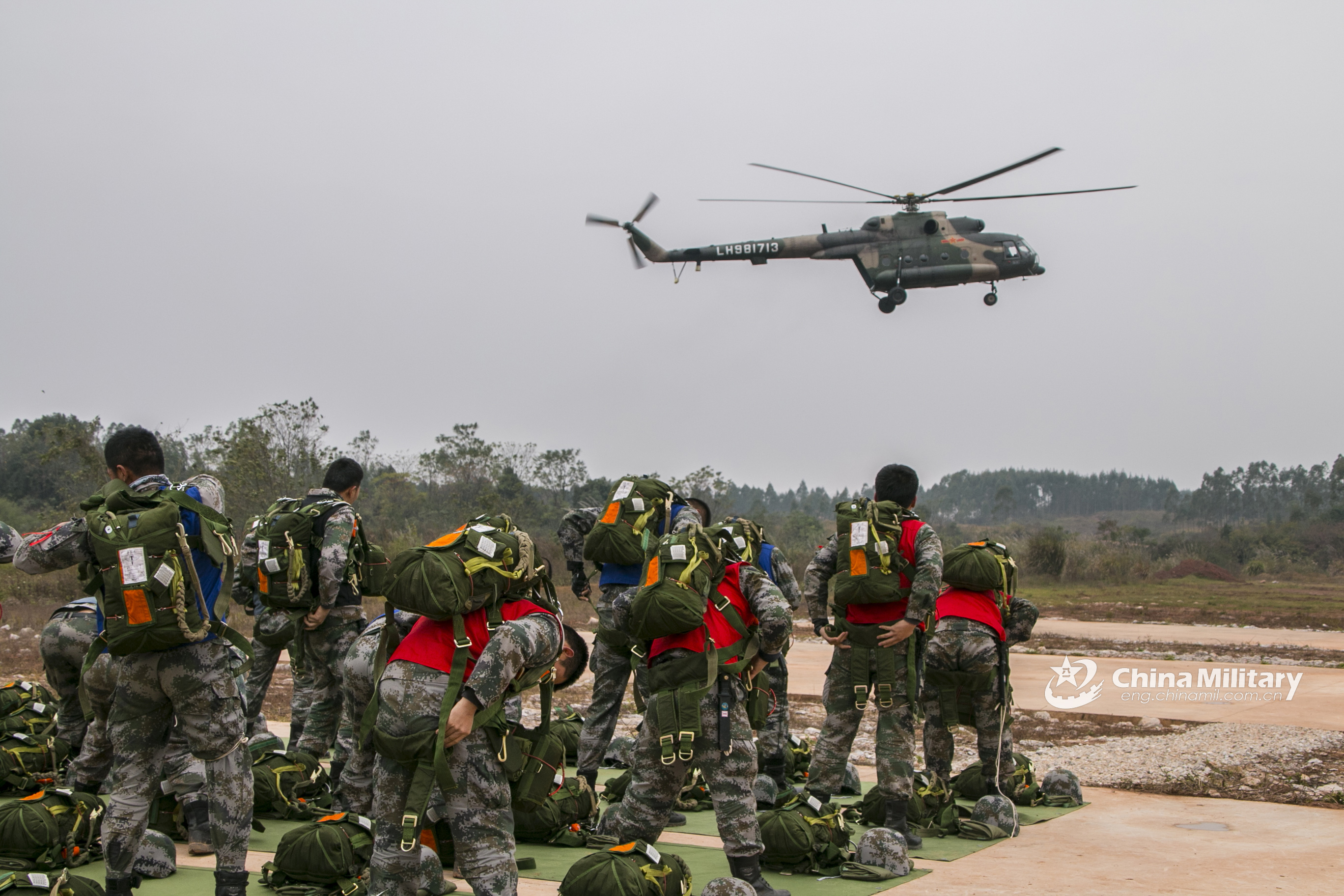 Paratroopers assigned to different special operations brigades of the PLA Army put on their parachuting gears prior to a parachute training course organized by the PLA Army Special Operations Academy in south China's Guangxi Zhuang Autonomous Region on December 13, 2018. (eng.chinamil.com.cn/Photo by Sun Xiaopeng, Xu Chunlong and Cai Fu)