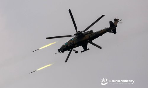 An WZ-10 attack helicopter attached to an air assault brigade with the PLA airborne troops fires rocketat mock ground targets during a round-the-clock live-fire flight training exercise focusing on stealthy penetration, formation assault and other combat operations in the hinterland of the Dabie Mountains of central China's Hubei Province in mid-April, 2019. (Photo: eng.chinamil.com.cn)