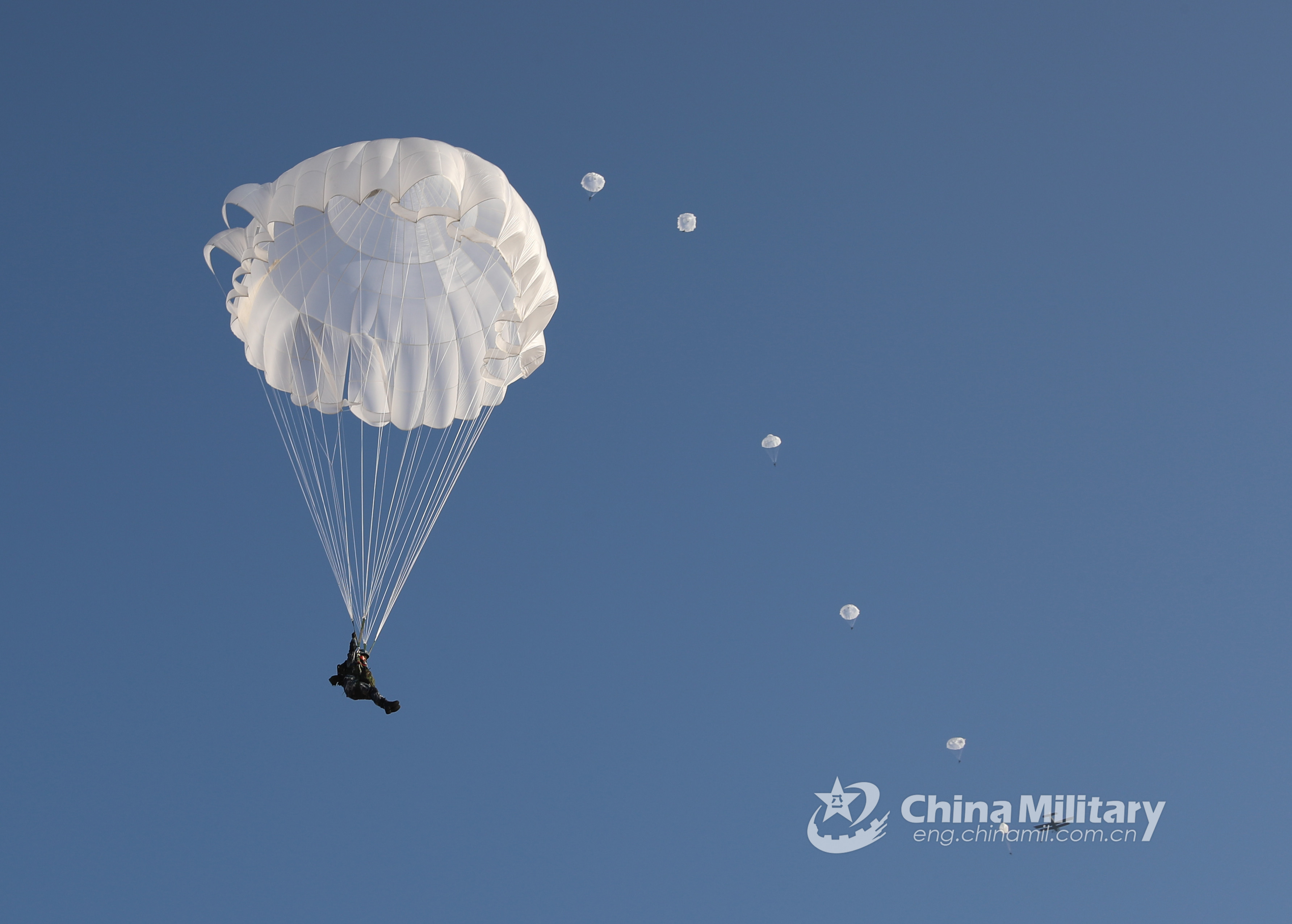 Female paratroopers assigned to an airborne unit under the PLA Air Force jump out of an airplane during their first parachute training on December 11, 2019. (eng.chinamil.com.cn/Photo by Min Yuxiang)