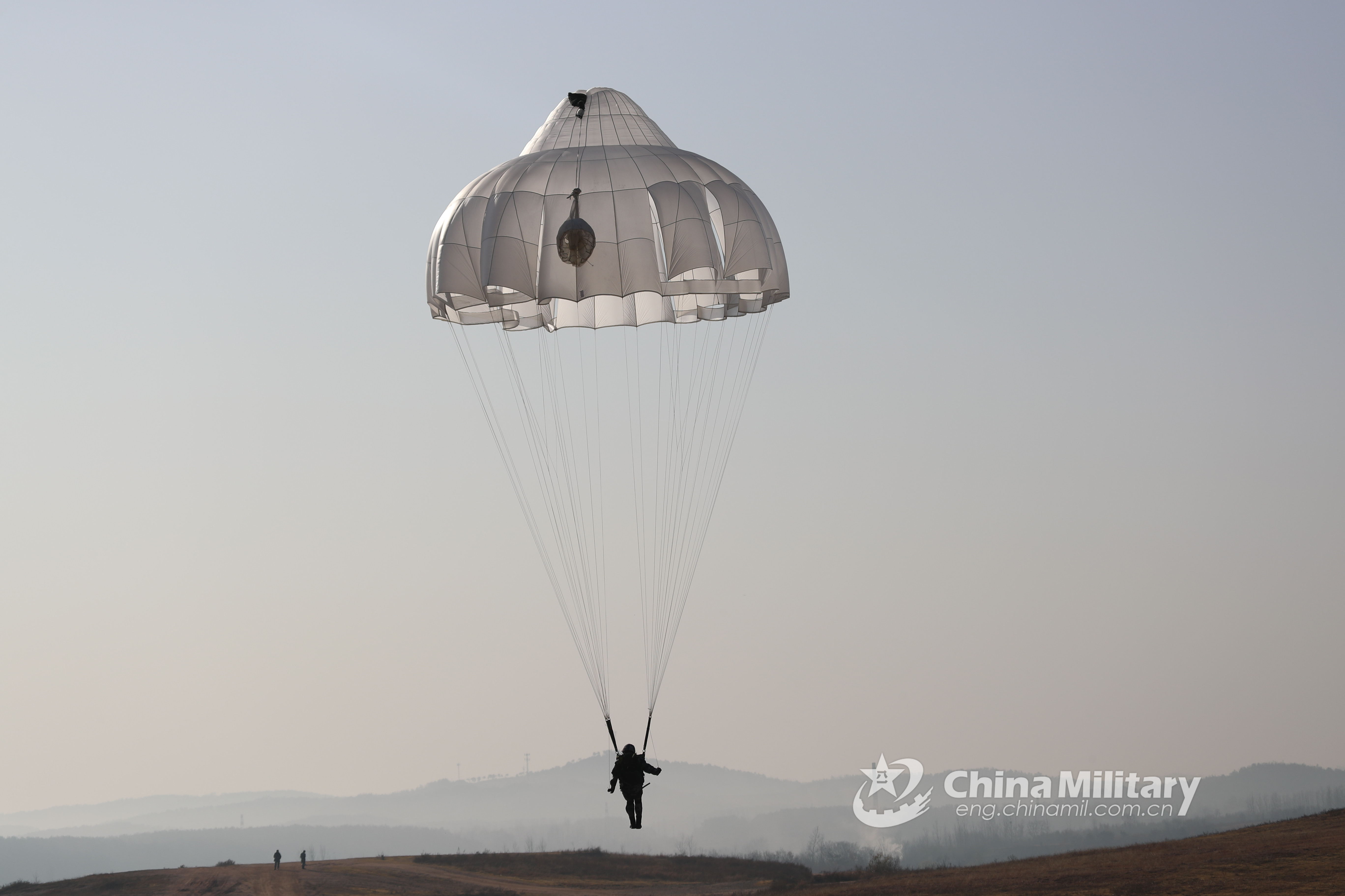 Female paratroopers assigned to an airborne unit under the PLA Air Force descend to the drop zone successively during their first parachute training on December 11, 2019. (eng.chinamil.com.cn/Photo by Min Yuxiang and Luo Jidong)