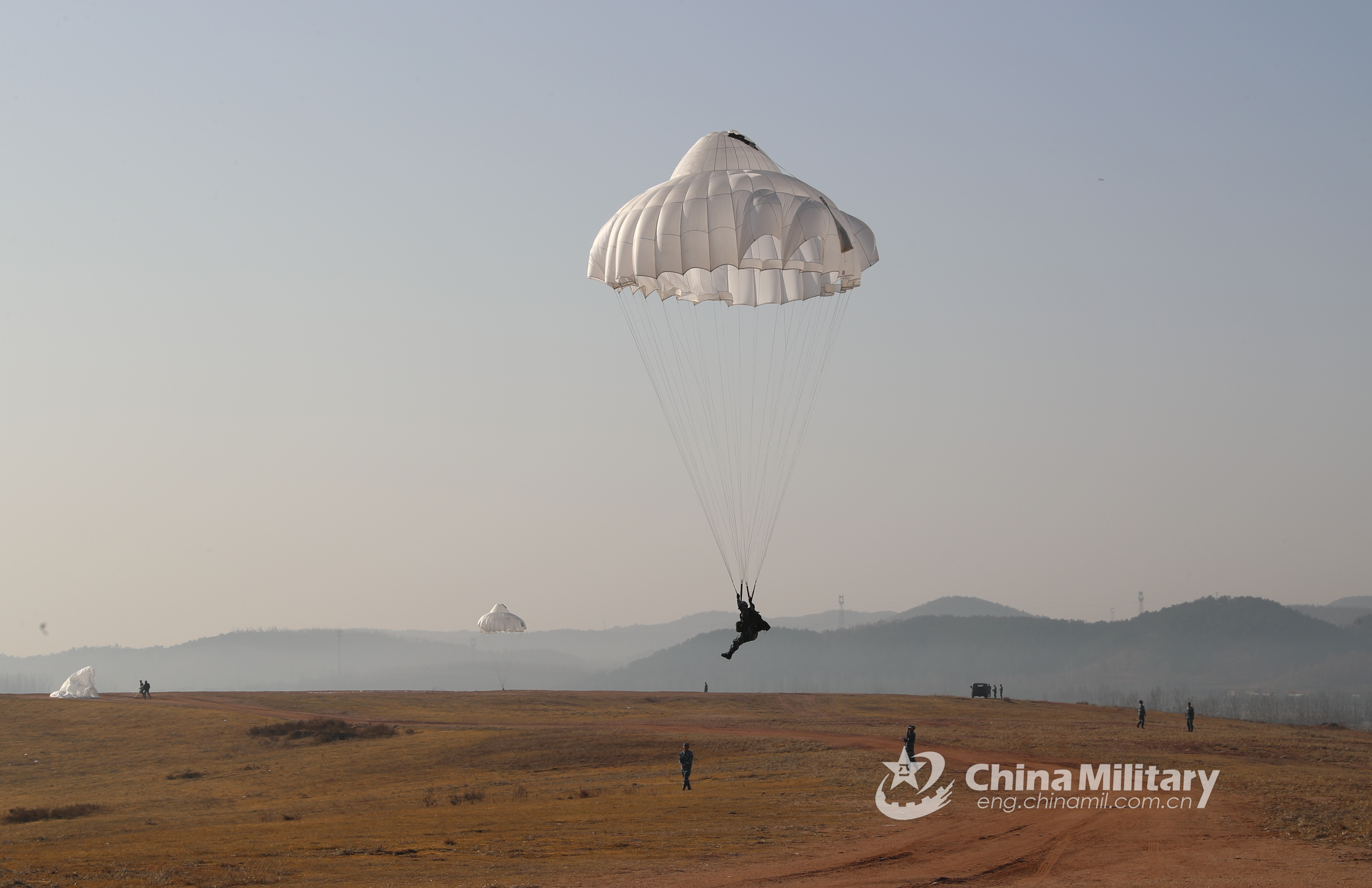Female paratroopers assigned to an airborne unit under the PLA Air Force descend to the drop zone successively during their first parachute training on December 11, 2019. (eng.chinamil.com.cn/Photo by Min Yuxiang and Luo Jidong)