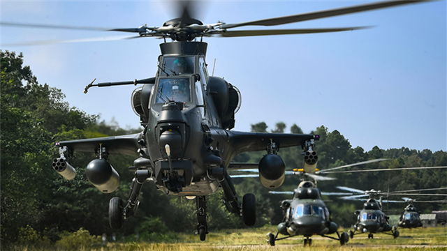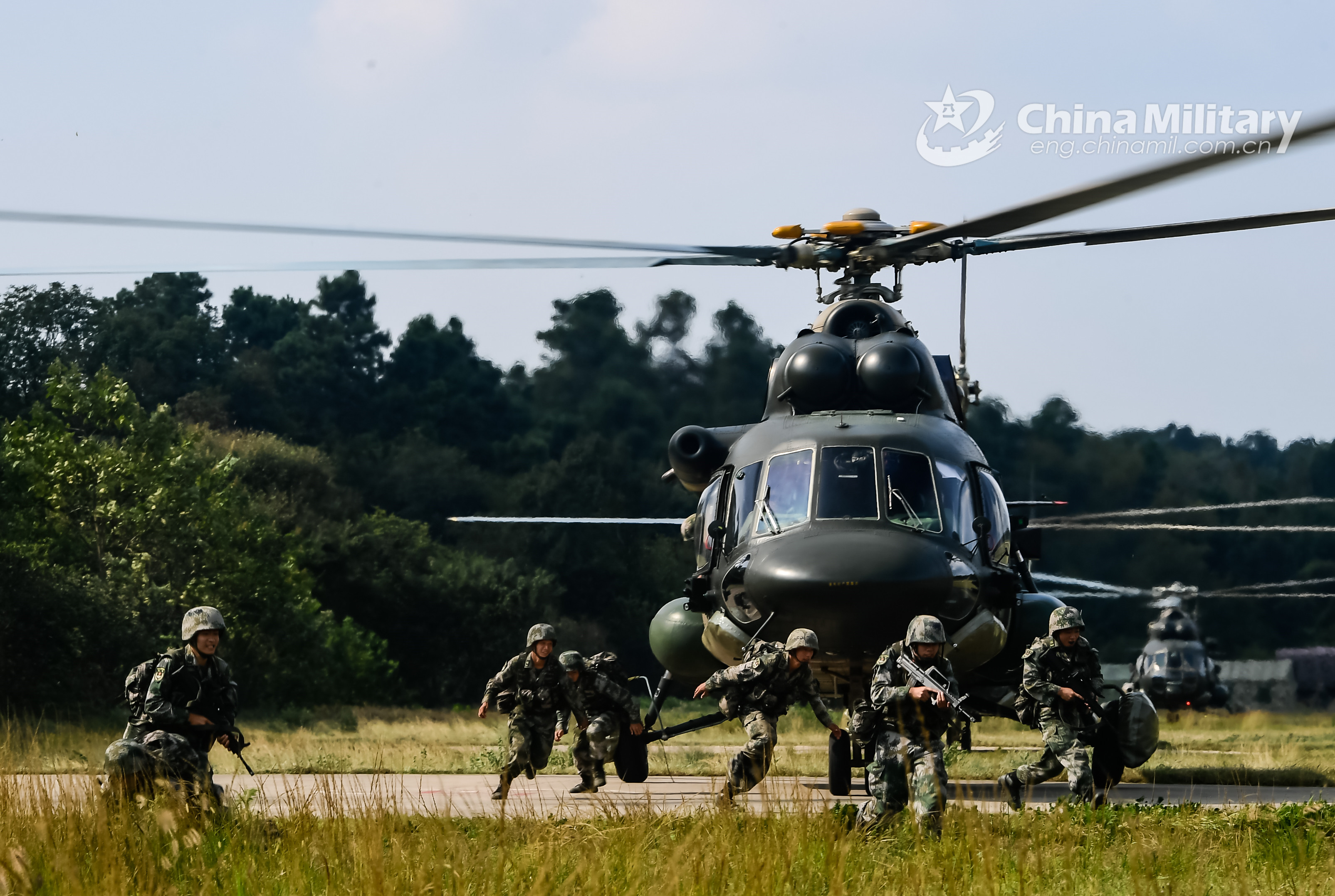 Soldiers assigned to an army aviation brigade under the PLA 73rd Group Army rush to occupy positions after disembarking from a transport helicopter during a realistic training exercise on September 26, 2020. The army aviation brigade conducts training subjects including fast-roping, firepower support and force projection, aiming to hone the troops’ joint operations capabilities. (eng.chinamil.com.cn/Photo by Li Shilong)