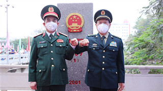 The picture shows General Wei Fenghe (R) and Sen. Lieut. Gen. Phan Van Giang (L) pose for a photo in front of the border monument No. 1369 (1) erected along the China-Vietnam border. (Photo by Li Xiaowei)