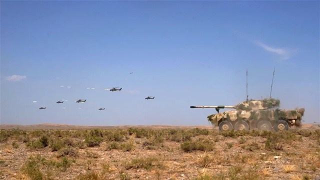 Military aircraft and armored vehicles conduct coordinated firing operations during the China-Russia joint exercise ZAPAD/INTERACTION-2021 held at a training base of the PLA Army in Qingtongxia City of West China's Ningxia Hui Autonomous Region from August 9 to 13, 2021. (eng.chinamil.com.cn/Photo by Zhang Jianping)
