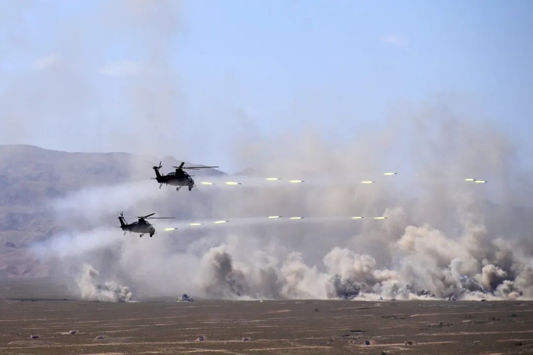 The Chinese military helicopters successively strike the mock terrorists' forward position in the live-fire drill of the China-Russia joint exercise ZAPAD/INTERACTION-2021 on the morning of August 13, 2021. (eng.chinamil.com.cn/Photo by Zhang Jianping)
