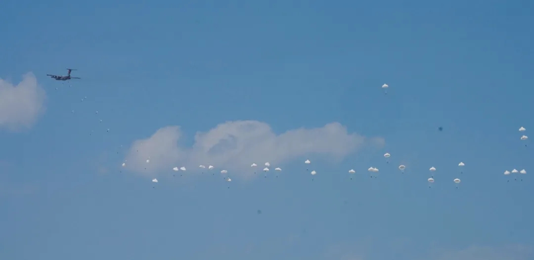 The second phase of live-fire drill in the China-Russia joint exercise ZAPAD/INTERACTION-2021 kicks off on the morning of August 13, 2021. The picture shows the fully armed paratroopers successively descend from the transport aircraft Y-20. (eng.chinamil.com.cn/Photo by Wang Weidong)