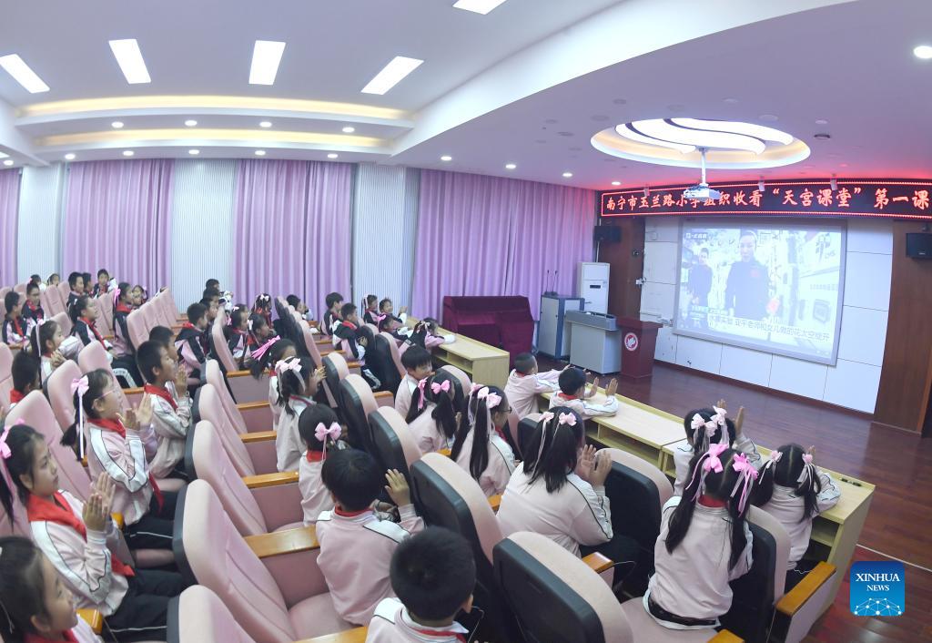 Students attend a live class given by the Shenzhou-13 crew members in Nanning, capital of south China's Guangxi Zhuang Autonomous Region, Dec. 9, 2021. The first live class from China's space station was held on Thursday afternoon, given by Shenzhou-13 crew members Zhai Zhigang, Wang Yaping and Ye Guangfu to students on Earth. (Xinhua/Zhou Hua)