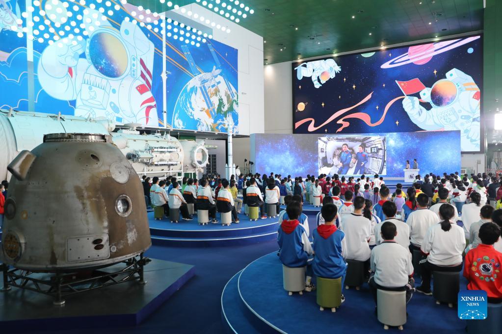 Students attend a live class given by the Shenzhou-13 crew members, at the China Science and Technology Museum in Beijing, capital of China, Dec. 9, 2021. The first live class from China's space station was held on Thursday afternoon, given by Shenzhou-13 crew members Zhai Zhigang, Wang Yaping and Ye Guangfu to students on Earth. (Xinhua/Jin Liwang)