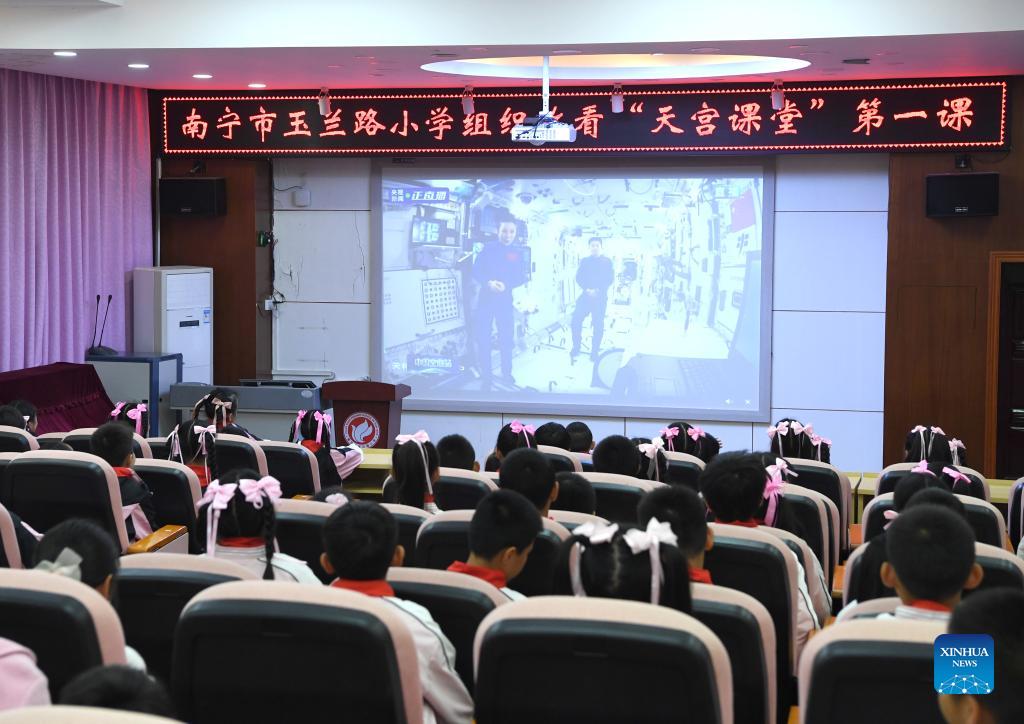 Students attend a live class given by the Shenzhou-13 crew members, in Nanning, capital of south China's Guangxi Zhuang Autonomous Region, Dec. 9, 2021. The first live class from China's space station was held on Thursday afternoon, given by Shenzhou-13 crew members Zhai Zhigang, Wang Yaping and Ye Guangfu to students on Earth. (Xinhua/Zhou Hua)