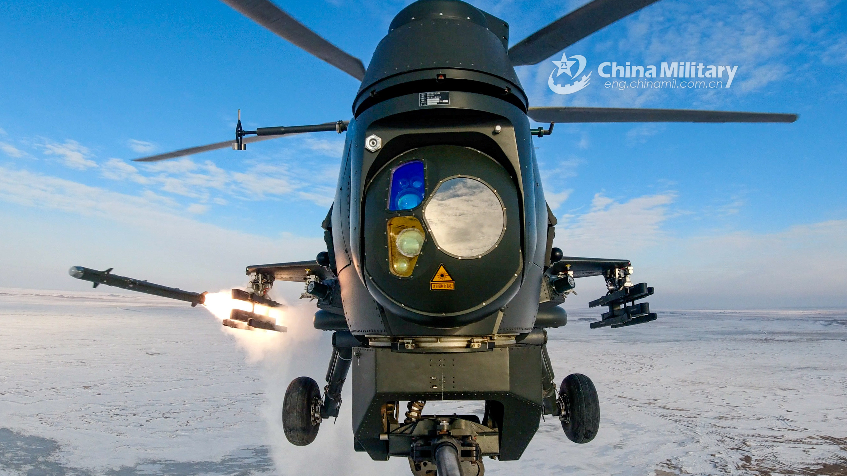 A WZ-10 attack helicopter attached to an army aviation brigade under the PLA 80th Group Army fires a missile at a mock target during a live-fire training exercise in early December, 2021. (eng.chinamil.com.cn/Photo by Li Peng)