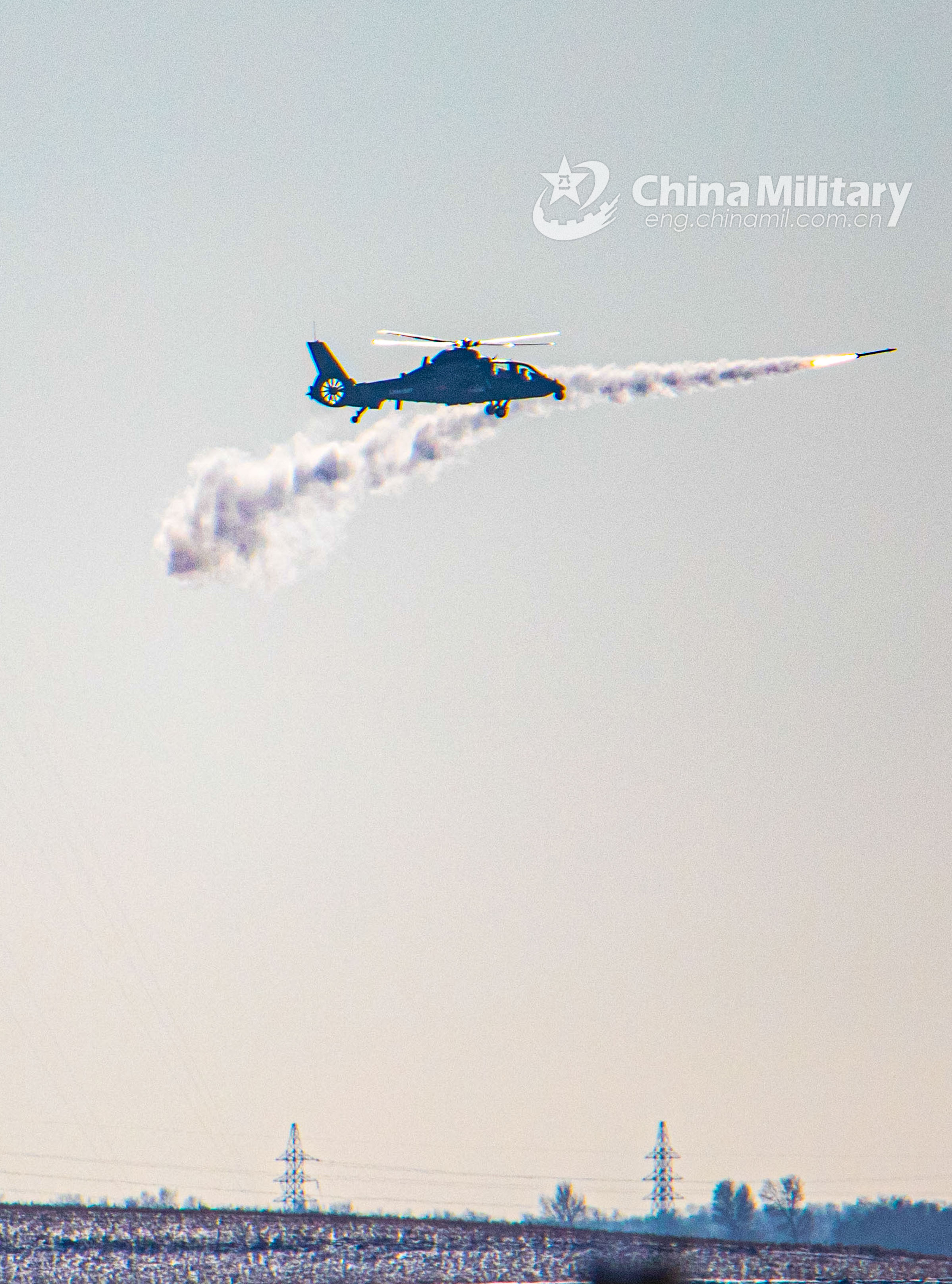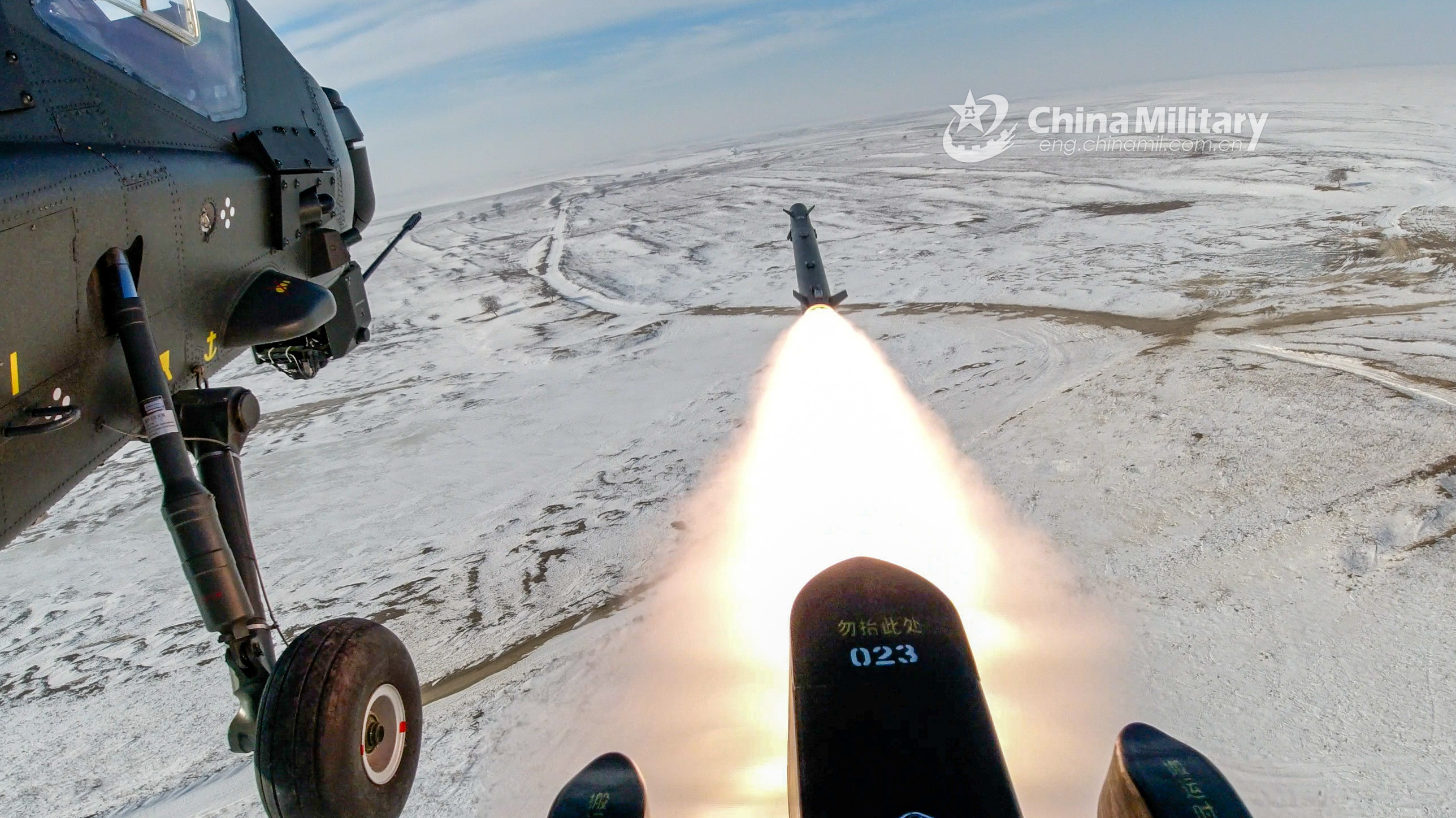 A WZ-10 attack helicopter attached to an army aviation brigade under the PLA 80th Group Army fires a missile at a mock target during a live-fire training exercise in early December, 2021. (eng.chinamil.com.cn/Photo by Li Peng)