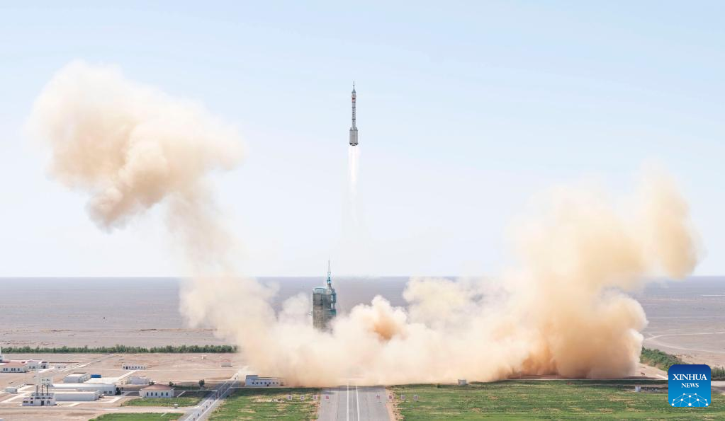 The crewed spaceship Shenzhou-14, atop a Long March-2F carrier rocket, is launched from the Jiuquan Satellite Launch Center in northwest China, June 5, 2022. About 577 seconds after the launch, Shenzhou-14 separated from the rocket and entered its designated orbit. The crew members are in good shape and the launch is a complete success. (Xinhua/Cai Yang)