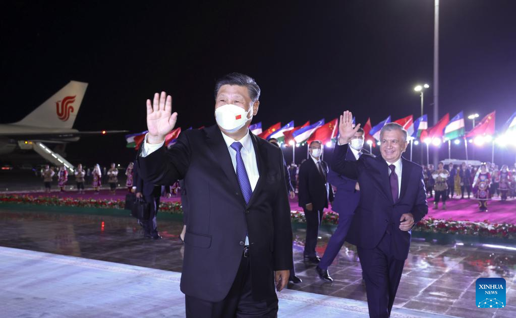SAMARKAND, Uzbekistan, Sept. 14 (Xinhua) -- Chinese President Xi Jinping arrived here Wednesday evening to pay a state visit to Uzbekistan and attend the 22nd meeting of the Council of Heads of State of the Shanghai Cooperation Organization (SCO).
