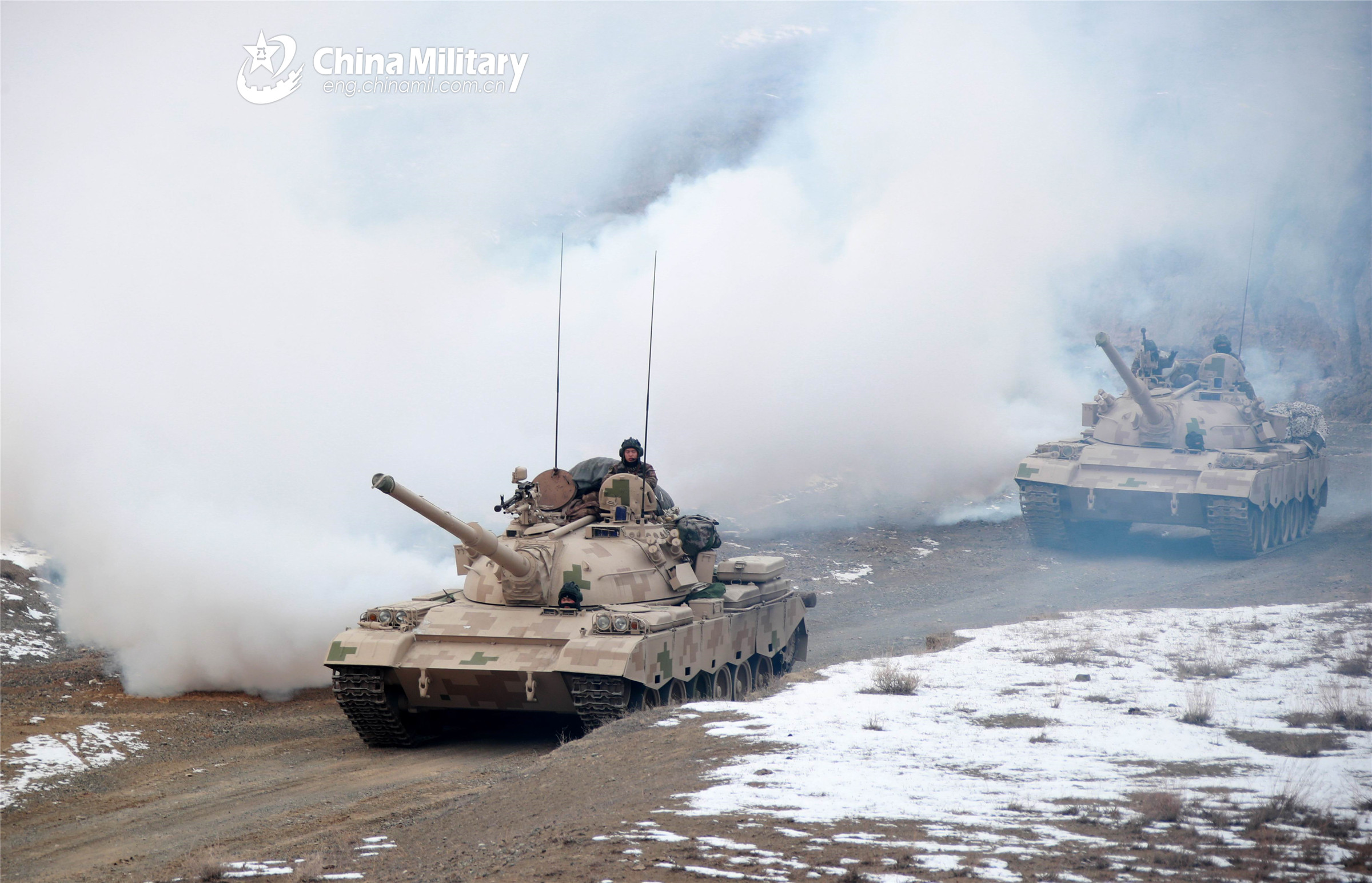 Main battle tanks (MBTs) attached to an armored element of a combined-arms regiment under the PLA Xinjiang Military Command are en route to the training field during a tactical maneuver training exercise on November 30, 2022. (eng.chinamil.com.cn/Photo by Yuan Kai)