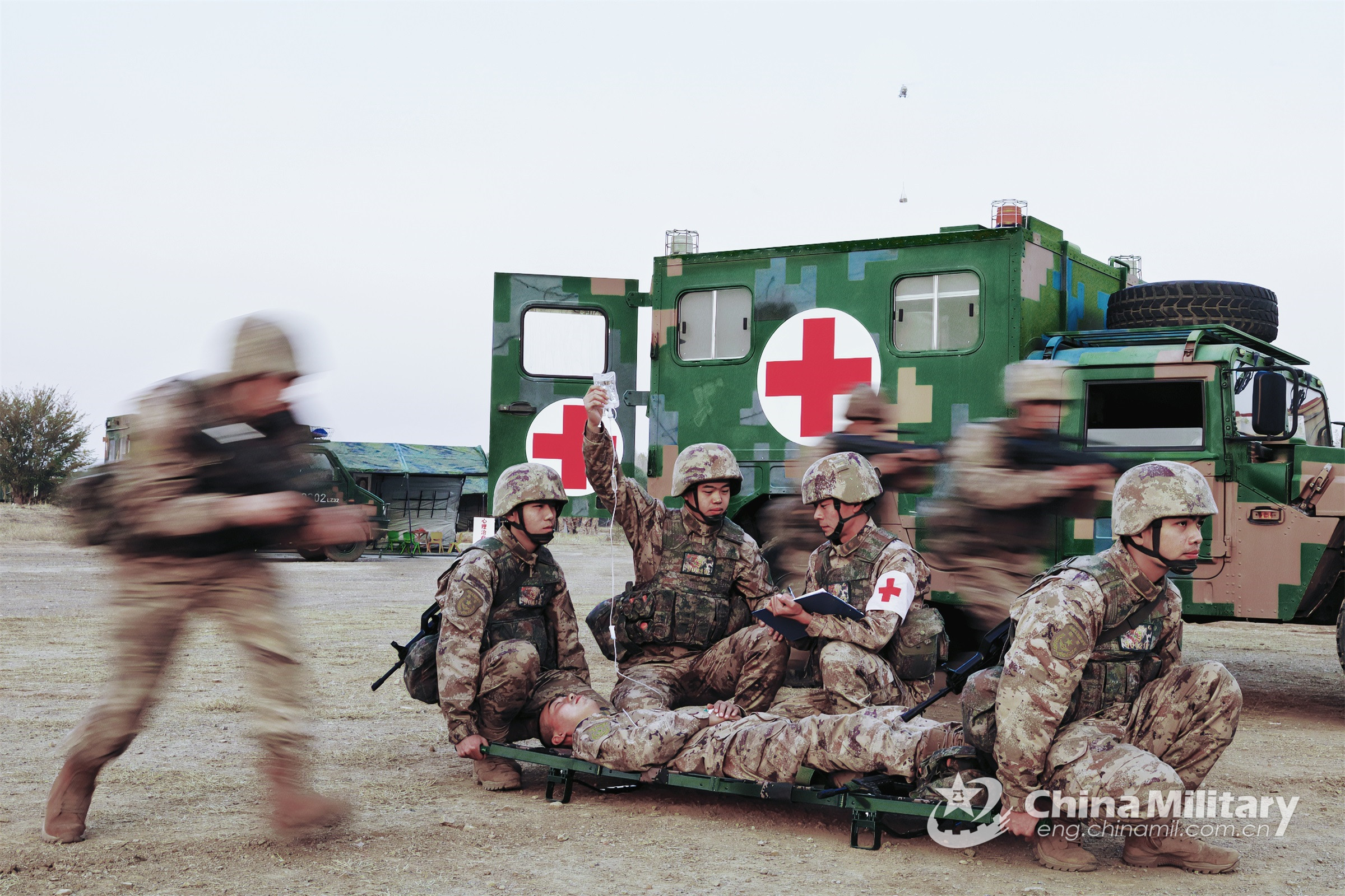 Medics assigned to a combined-arms brigade with the army under the PLA Central Theater Command give first aid treatment to and transfer the "wounded" during a real combat medical support training exercise on November 28, 2022. (eng.chinamil.com.cn/Photo by Yan Qizhao)
