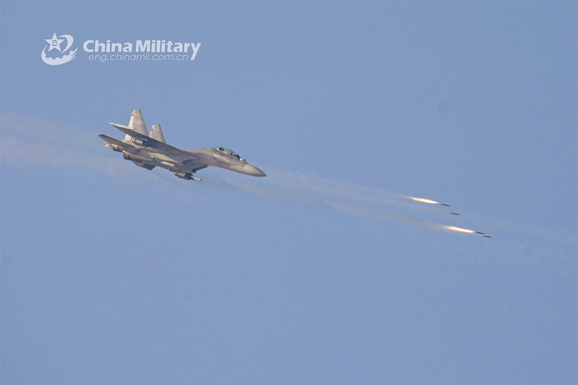 A fighter jet attached to an aviation brigade of the air force under the PLA Northern Theater Command fires rockets at simulated aerial targets during a live-fire training exercise in the New Year.(eng.chinamil.com.cn/Photo by Li Xiangping and Liang Pengyu)