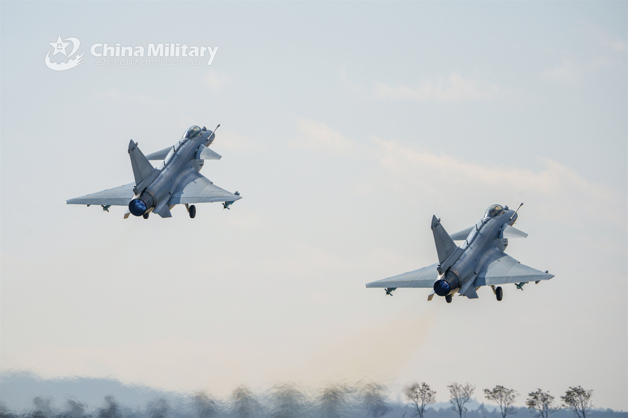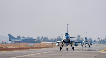 Fighter jets attached to an aviation brigade under the PLA Southern Theater Command take off from the runway and soar into the sky during a flight training exercise on January 6, 2023.(eng.chinamil.com.cn/Photo by Wang Guoyun)